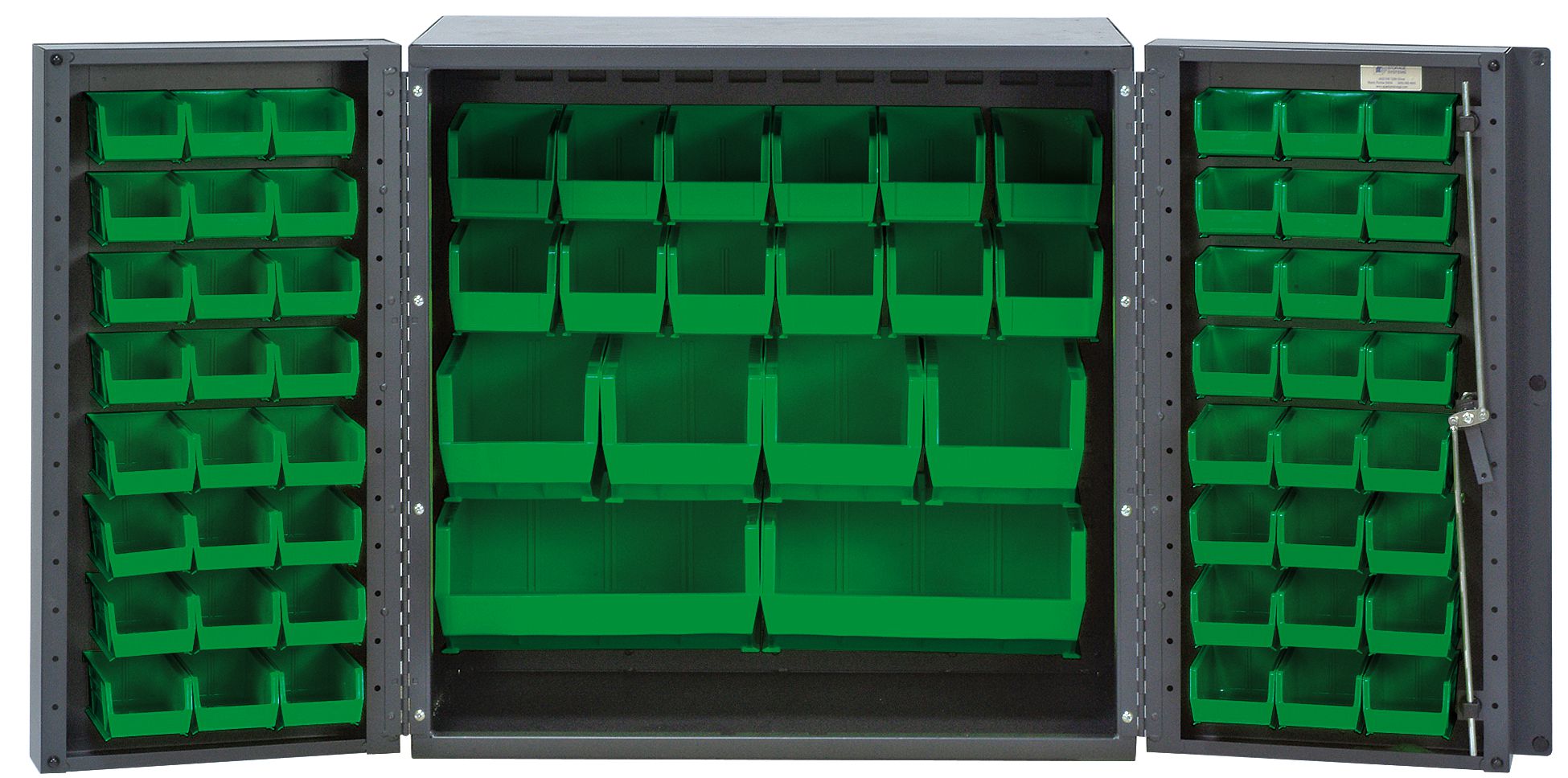 Bin Cabinet All-Welded With Green Bin 36In^ Bin Cabinet All-Welded, With Green Bin, Made From 14In Gauge Steel For Added Strength, Provides Security For Stored Contents With Three Point Locking Door And Keys, With Gray Baked Enamel Finish, Preassembled, No. Bins: 66, Outer Dimension: 36 X 24 X 36I