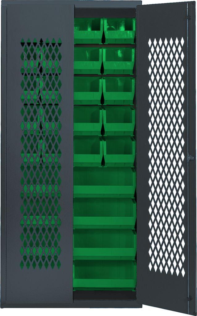 Specialty Bin Cabinet Green 36In^ Specialty Bin Cabinet, With Green Bins, Louvered Back Wall Fitting, Mesh Security Doors For High Visibility, With 2 Different Sized Bin Compartments And 3 Point Locking Handle, With 2 Keys, And 14In Gauge Cabinet, No. Of Bins: 20 8, Outer Dimension: 36 X 18 X 78I