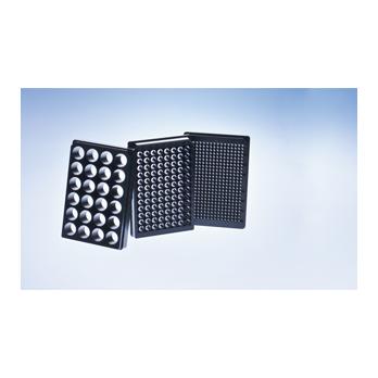 Additional Info Microplates exhibit a bottom flatness better than 100µm to offer high quality performance for all applications where low autofluorescence and exceptional optical clarity are required. Ideal for high-resolution imaging, sensitive fluorescence, and confocal microscopy such as single molecule detection (SMD). Transmission measurements are capable in the wavelength range above 350nm. Plates consist of a 175µm thick borosilicate glass-bottom plate bonded with a black polystyrene frame and features a chimney-well to help prevent cross contamination. Plates are sterile, comply with SBS recommendations, and include a lid.F 073048_Microplate Selection Guide_41