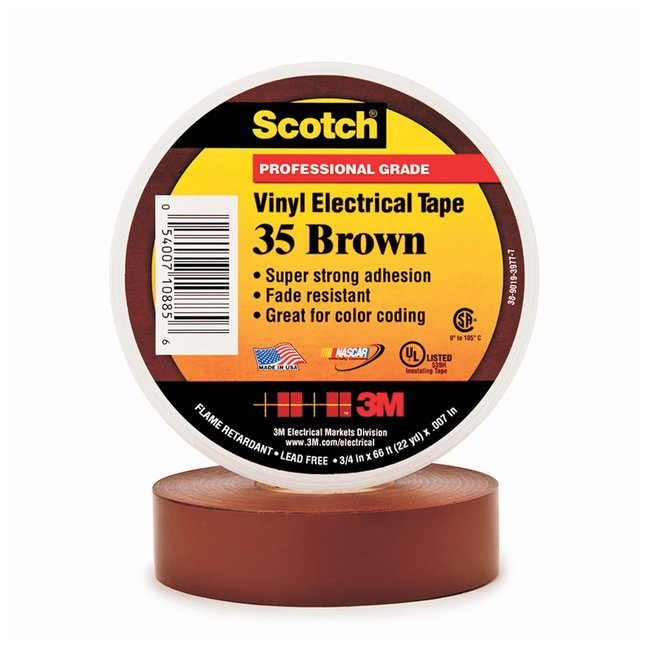 Stretches to conform to virtually any shape that requires color-coded insulationProvides joint, termination, and connector insulationStands up to harsh weather conditions and broad temperature ranges3M Catalog# 35-1/2X20FT-BR , 3M Catalog# 35-1/2X20FT-OR , 3M Catalog# 35-1/2X20FT-RDOrder InfoRolls measure 1/2 in. × 20 ft.. Made in USA.ComplianceUL Listed.