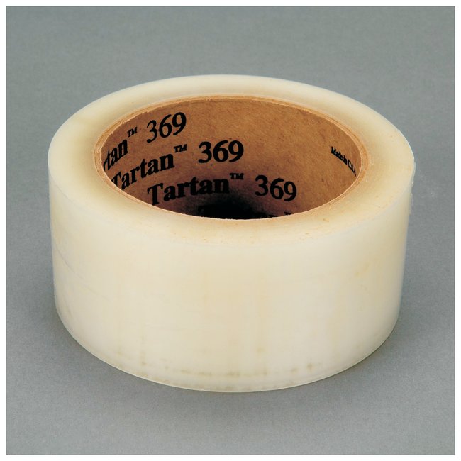 Pressure-sensitive, hot-melt, synthetic-rubber adhesiveAdheres to a variety of surfacesLow-strength, conformable, clear polypropylene-film backingEasy unwind with edge-tear and split resistanceGood holding power to fiberboardRoll-to-roll consistencyIdeal for use in medical, general industrial, electronics, MRO, food and beverage and paper and print applicationsDimensions and Adhesion:Thickness: 0.04mm (1.6 mil)Width: 48mm (1.88 in.)Length: 100m (109.36 linear yards)Adhesion to Steel: 32 N/100mm (30 oz./in.) widthCore Size: 7.6cm (3 in.)Tensile Strength:Machine Direction: 333 N/100mm (19 lbs./in.) widthCross Direction: 666 N/100mm (38 lbs./in.) widthElongation at Break: 160%Thickness — Backing: 0.025mm (1.0 mil)Total: 0.041mm (1.6 mil)Holding Power to Fiberboard: 1000 minutes3M Catalog# 369ComplianceMeets FDA requirements for indirect food contact. ASTM methods used include: D-3330 (for adhesion to steel), D-3759 (for tensile strength and elongation at break), D-3652 (for thickness of backing, D-3654 (for holding power to fiberboard).