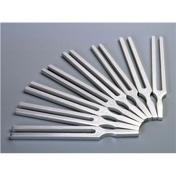Tuning forks made from alluminum alloy. The frequency and leter scale is stamped on each fork.