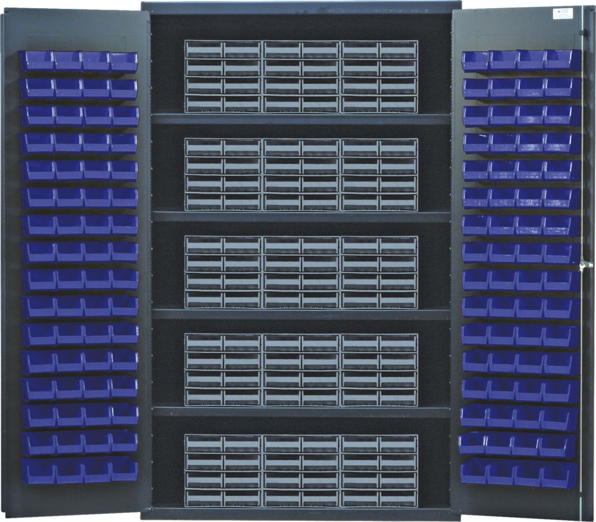 Storage Cabinet With Interlocking Drawer 48In^ Storage Cabinet With Interlocking Drawer, With Blue Bins, And 14 Gauge All Welded Steel, Features, Gray Baked-Enamel Finish, 3 Point Locking Handle With 2 Keys And With Louvered Doors, No. Bins: 128, No. Drawers: 120, Outer Dimension: 48 X 24 X 78I