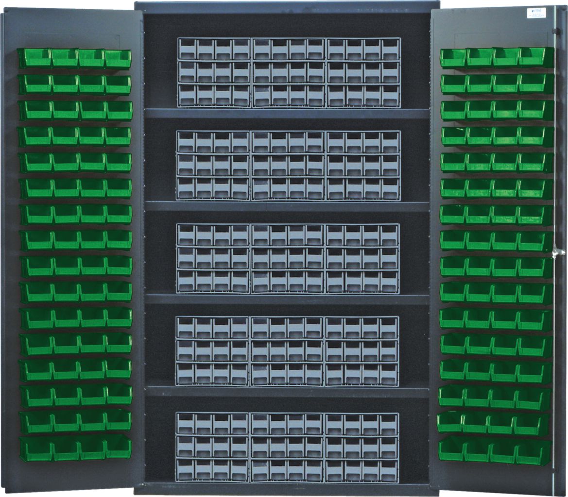 Storage Cabinet With Interlocking Drawer 48In^ Storage Cabinet With Interlocking Drawer, With Green Bins, Provides Security For The Storage Of Industrial Parts And Spares, Features 15 Interlocking Drawer Cabinets, With Louvered Door, No. Bins: 128, No. Drawers: 180, Outer Dimension: 48 X 24 X 78I