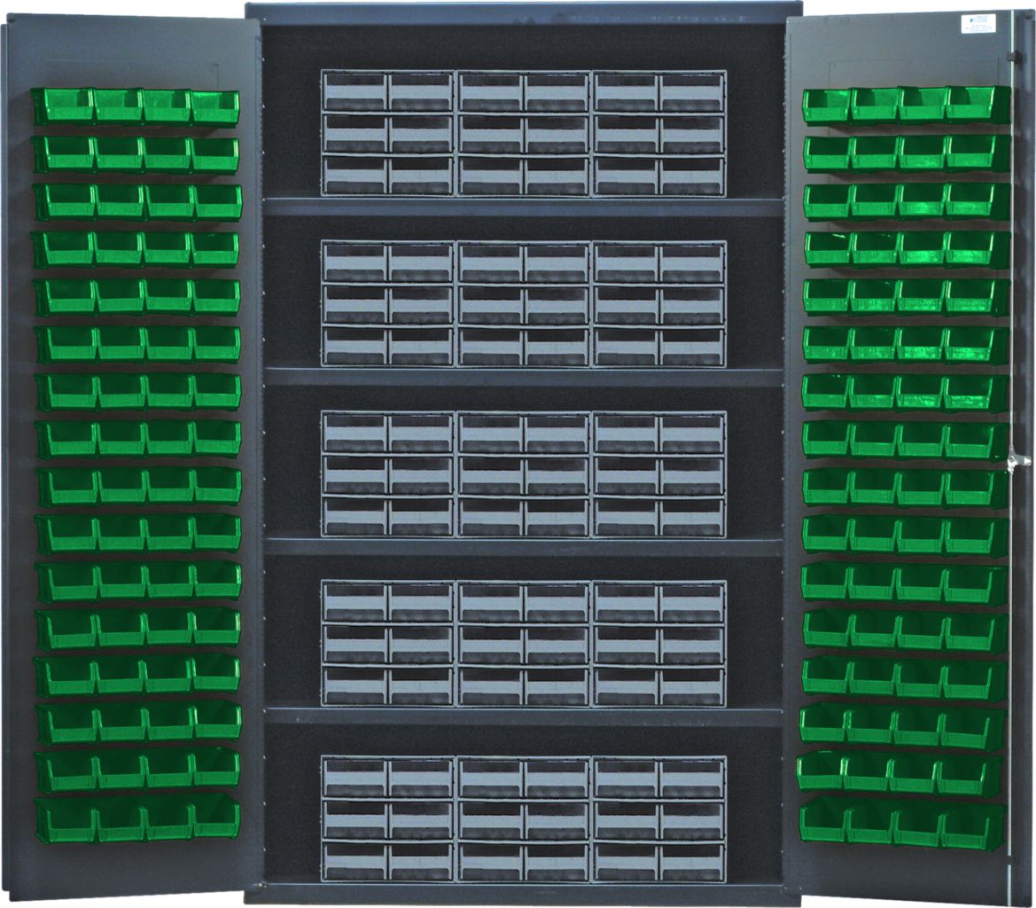 Storage Cabinet With Interlocking Drawer 48In^ Storage Cabinet With Interlocking Drawer, With Green Bins, And 14 Gauge All Welded Steel, Features, Gray Baked-Enamel Finish, 3 Point Locking Handle With 2 Keys And With Louvered Doors, No. Bins: 128, No. Drawers: 90, Outer Dimension: 48 X 24 X 78I