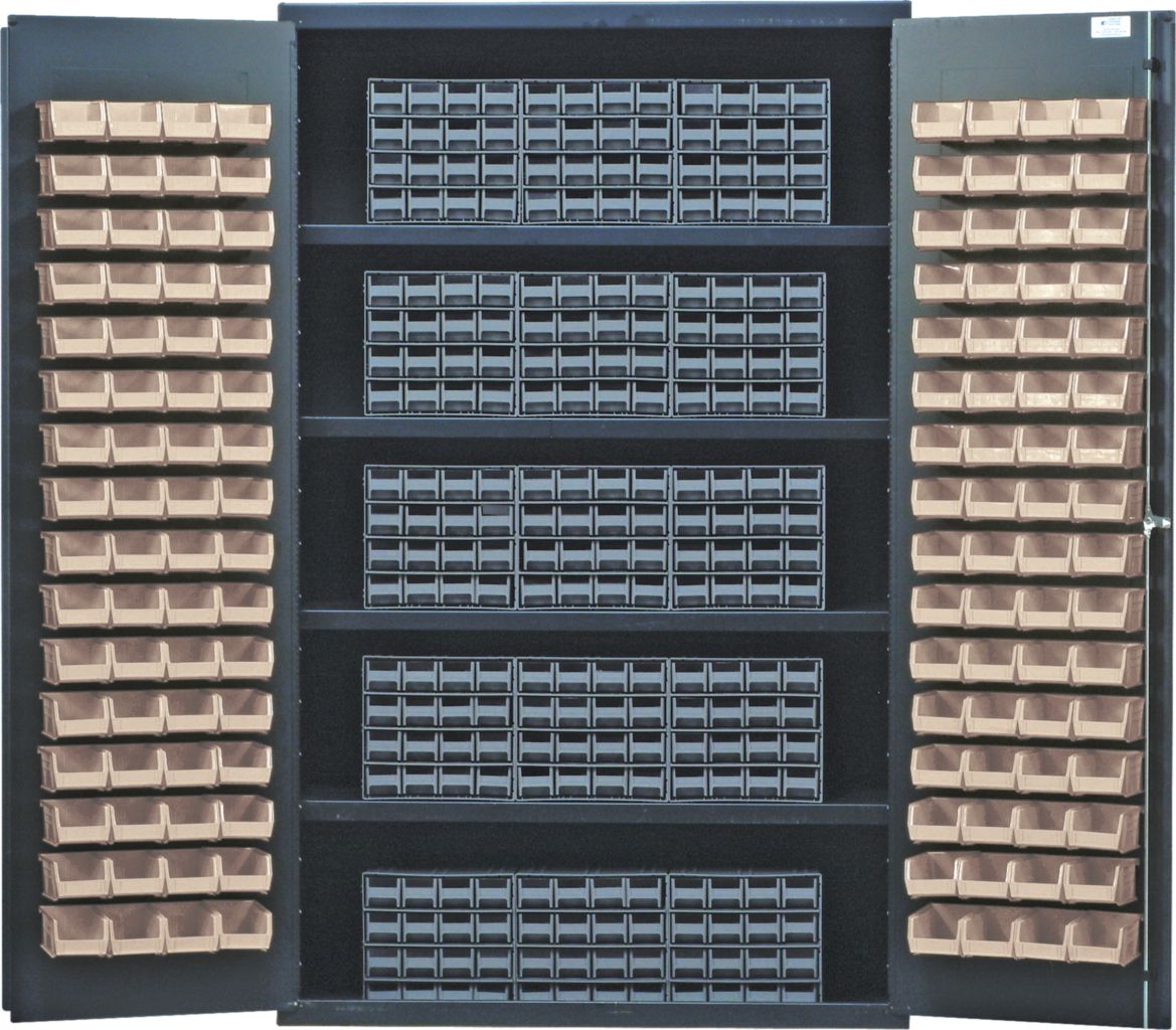 Storage Cabinet With Interlocking Drawer 48In^ Storage Cabinet With Interlocking Drawer, With Ivory Bins, And 14 Gauge All Welded Steel, Features, Gray Baked-Enamel Finish, 3 Point Locking Handle With 2 Keys And With Louvered Doors, No. Bins: 128, No. Drawers: 240, Outer Dimension: 48 X 24 X 78I