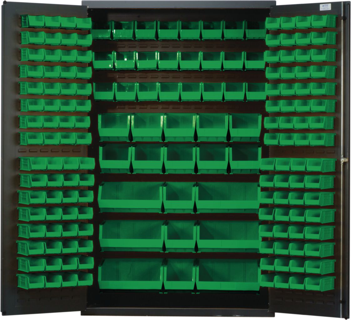 Bin Cabinet All-Welded With Green Bin 48In^ Bin Cabinet All-Welded With Green Bin, Made From 14In Gauge All-Welded Steel For Added Strength, Provides Security For Stored Contents With Three Point Locking Handle And Keys, With Gray Baked Enamel Finish, No. Bins: 171, Outer Dimension: 48 X 24 X 78I