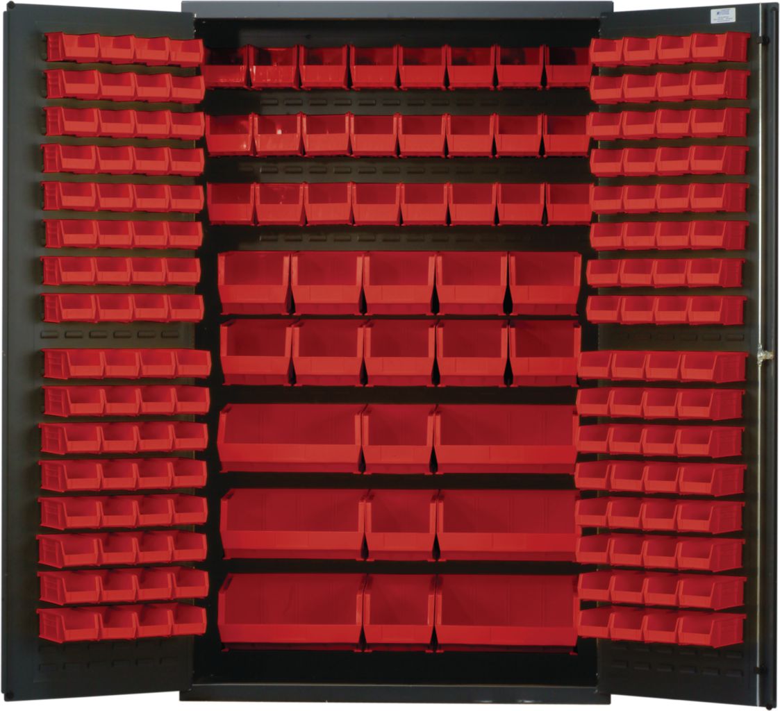 Bin Cabinet All-Welded With Red Bin 48In^ Bin Cabinet All-Welded With Red Bin, Made From 14In Gauge All-Welded Steel For Added Strength, Provides Security For Stored Contents With Three Point Locking Handle And Keys, With Gray Baked Enamel Finish, No. Bins: 171, Outer Dimension: 48 X 24 X 78I