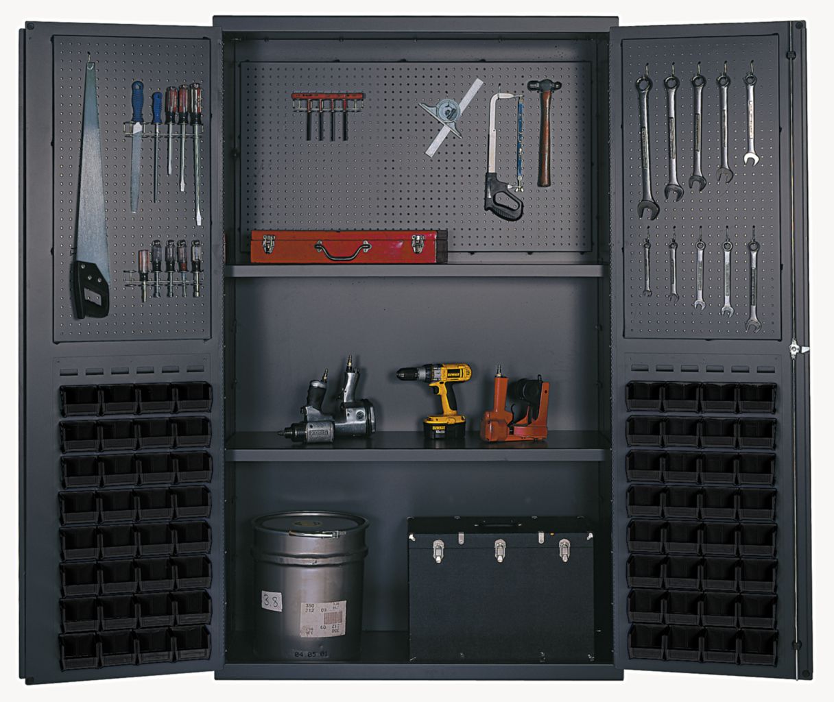 Bin Cabinet All-Welded With Black Bin 48In^ Bin Cabinet All-Welded With Black Bin, Made From 14In Gauge All-Welded Steel For Added Strength, 2 Adjustable Interior Shelves And Also With Three Point Locking Handle And Keys, With Gray Baked Enamel Finish, No. Bins: 64, Outer Dimension: 48 X 24 X 72I