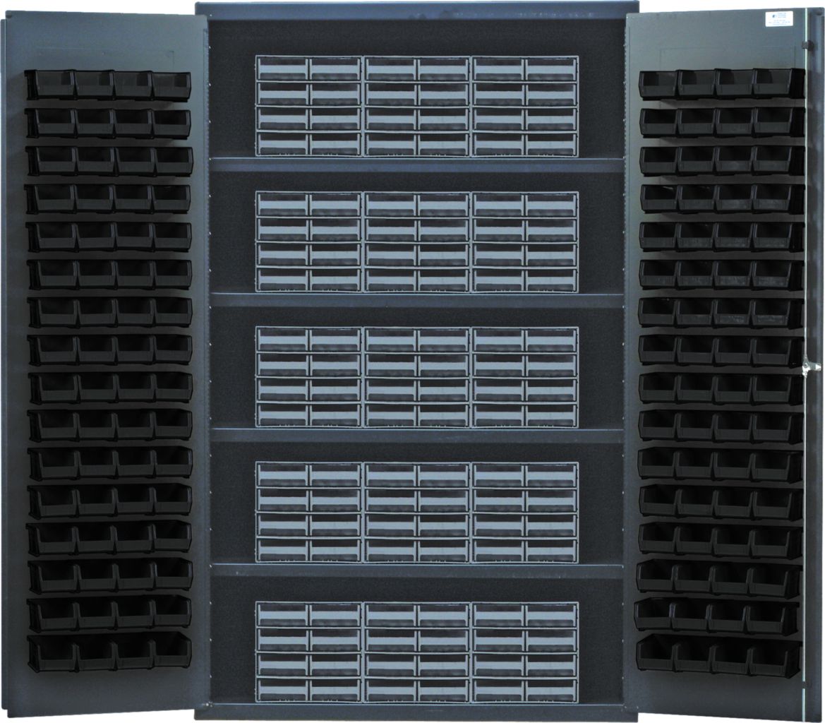 Storage Cabinet With Interlocking Drawer 48In^ Storage Cabinet With Interlocking Drawer, With Black Bins, And 14 Gauge All Welded Steel, Features, Gray Baked-Enamel Finish, 3 Point Locking Handle With 2 Keys And With Louvered Doors, No. Bins: 128, No. Drawers: 120, Outer Dimension: 48 X 24 X 78I