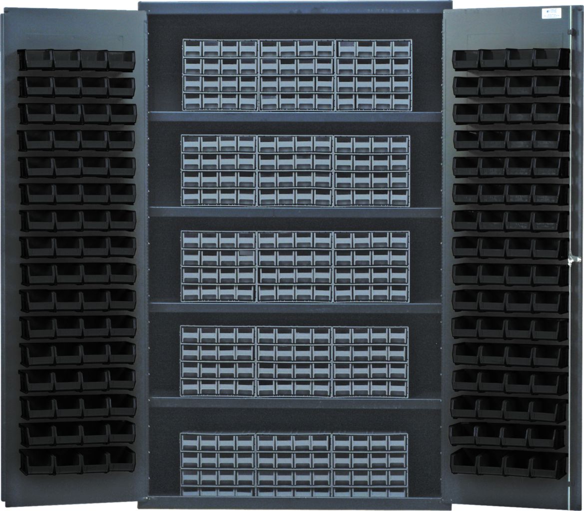 Storage Cabinet With Interlocking Drawer 48In^ Storage Cabinet With Interlocking Drawer, With Black Bins, And 14 Gauge All Welded Steel, Features, Gray Baked-Enamel Finish, 3 Point Locking Handle With 2 Keys And With Louvered Doors, No. Bins: 128, No. Drawers: 240, Outer Dimension: 48 X 24 X 78I