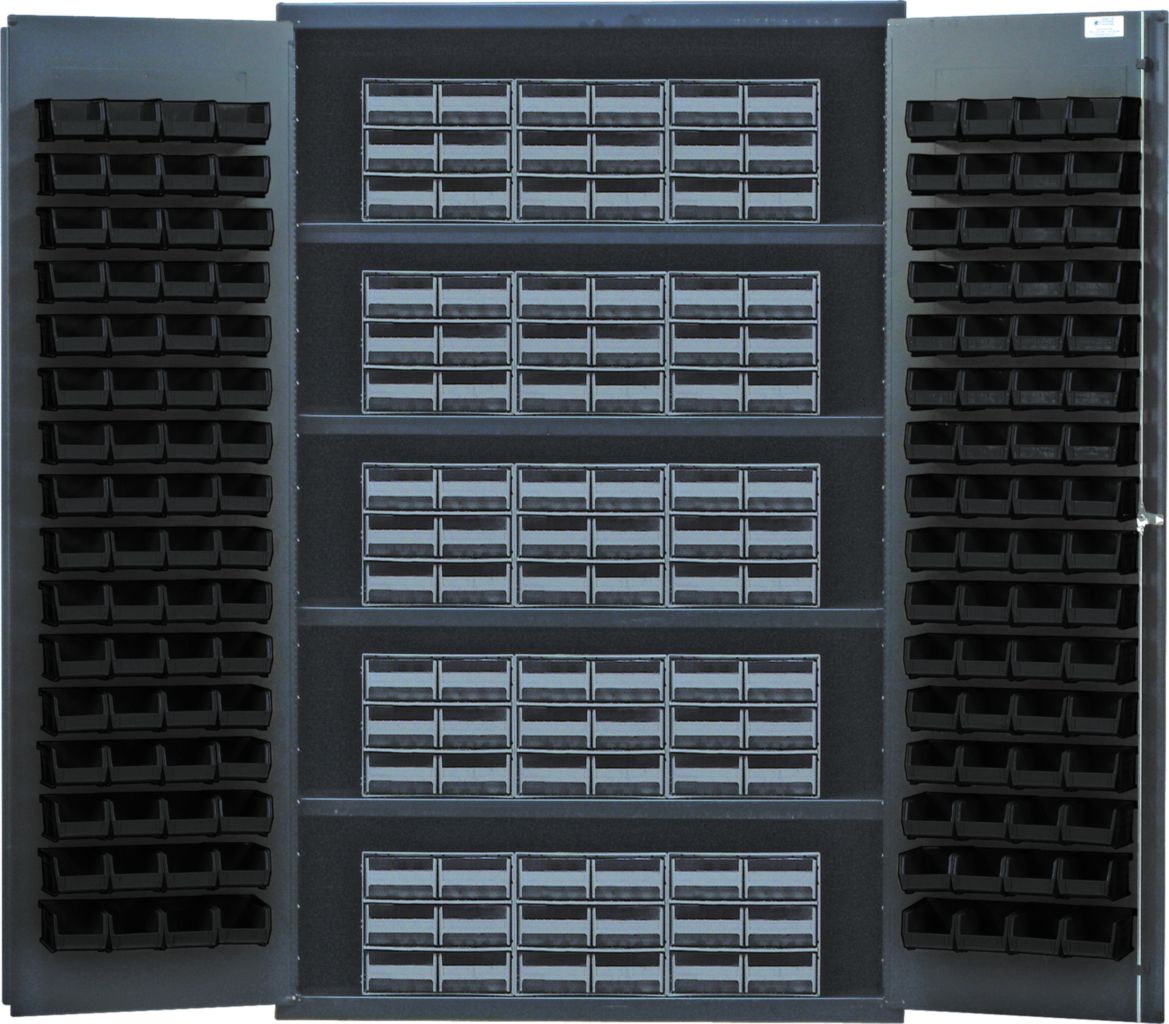 Storage Cabinet With Interlocking Drawer 48In^ Storage Cabinet With Interlocking Drawer, With Black Bins, And 14 Gauge All Welded Steel, Features, Gray Baked-Enamel Finish, 3 Point Locking Handle With 2 Keys And With Louvered Doors, No. Bins: 128, No. Drawers: 90, Outer Dimension: 48 X 24 X 78I