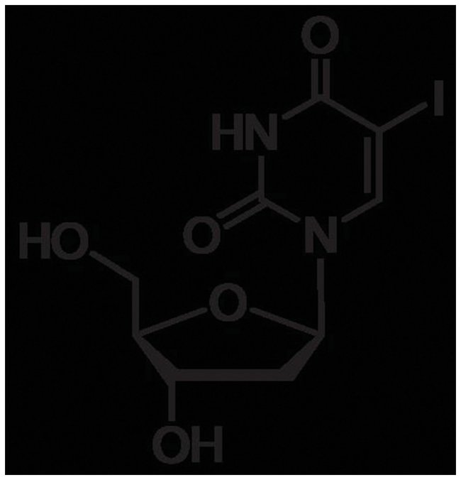 5-Iodo-2'-deoxyuridine (5-IUdR; IdUrd) is a pyrimidine analog (halogenated thymidine) that has antiviral activity agains vaccinia virus (orthopoxviruses); IdUrd is used as a radiosensitizer in human cancer studie