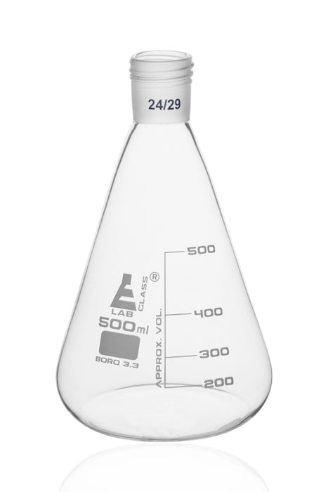 500ml capacity boiling flask made of high quality, heavy duty borosilicate glass. Screw thread joint. Socket size 24/29. No stopper included. Flask measures 7" tall, and is 4" in diameter.