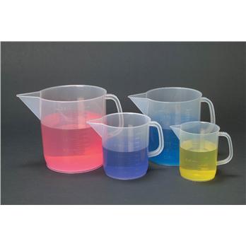 These handy short form jugs, molded in polypropylene, are clear, autoclavable and have good chemical resistance. All sizes have handles for convenient lifting, and feature raised graduations.