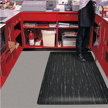 Durable smooth marble-pattern top surface of heavy-duty vinyl; easy to sweep or mop clean; sloped beveled edges to reduce tripping hazards and allow easy access on and off the mat. Overall thickness: 1/2 "