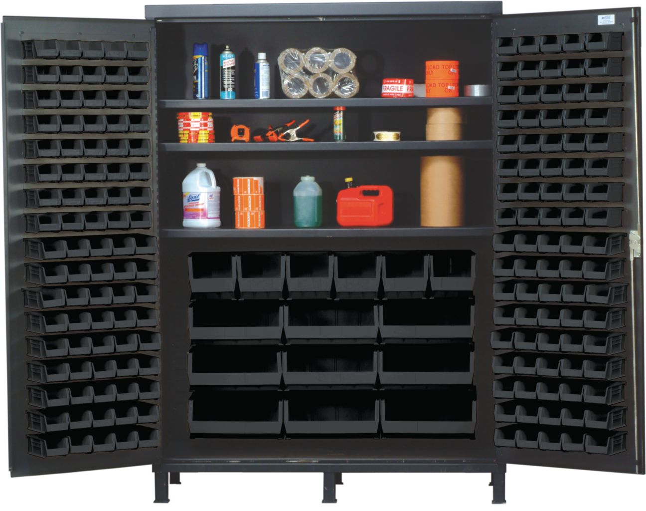 Bin Cabinet All-Welded With Black Bin 60In^ Bin Cabinet All-Welded With Black Bin, Made From 14In Gauge All-Welded Steel For Added Strength, Provides Security For Stored Contents With Three Point Locking Handle And Keys, With Gray Baked Enamel Finish, No. Bins: 185, Outer Dimension: 60 X 24X 84I