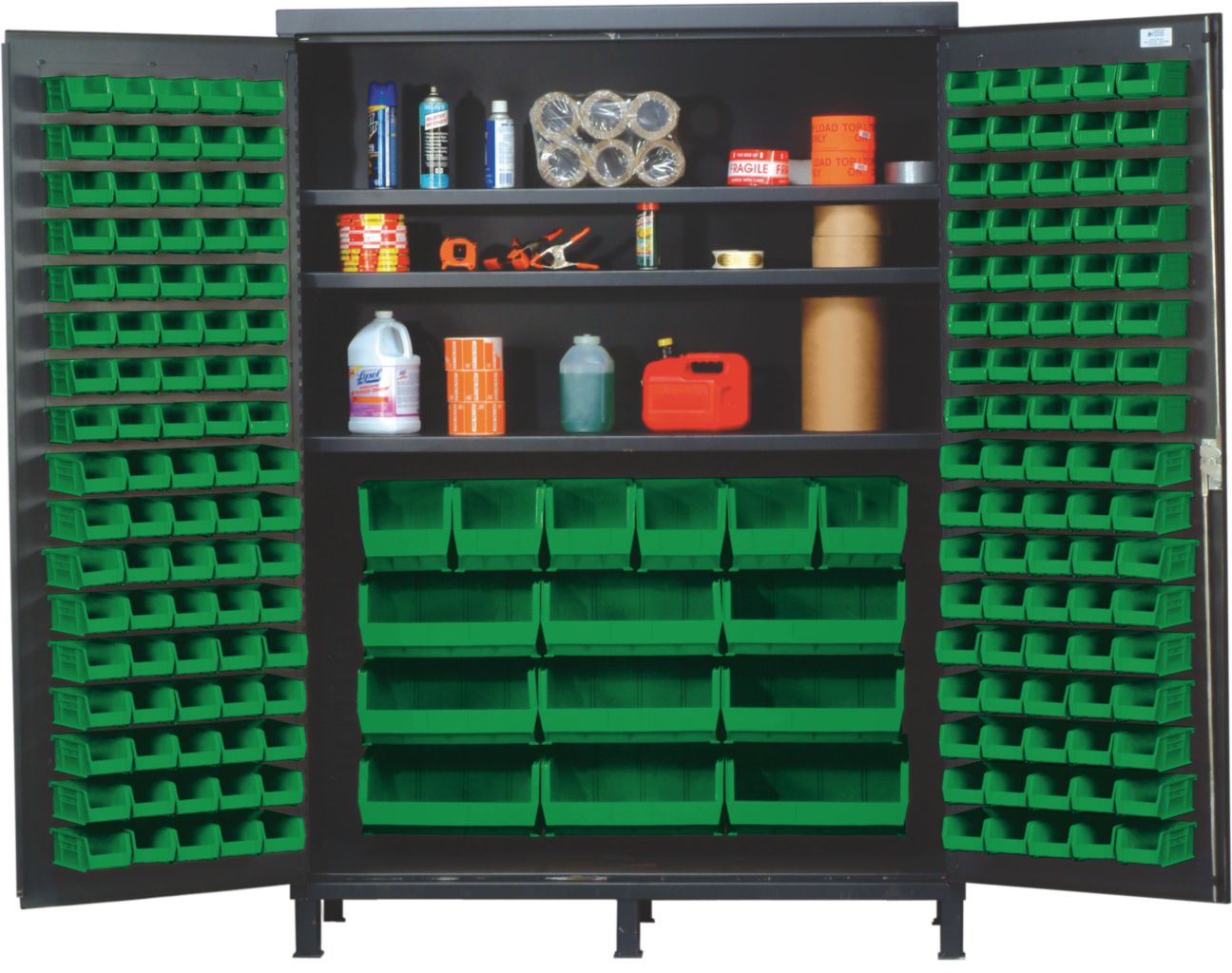 Bin Cabinet All-Welded With Green Bin 60In^ Bin Cabinet All-Welded With Green Bin, Made From 14In Gauge All-Welded Steel For Added Strength, Provides Security For Stored Contents With Three Point Locking Handle And Keys, With Gray Baked Enamel Finish, No. Bins: 185, Outer Dimension: 60 X 24 X 84I