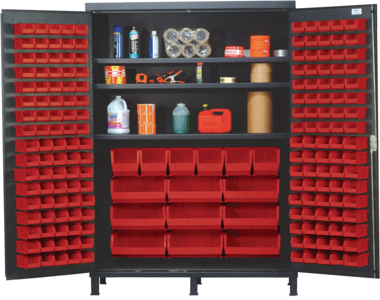 Bin Cabinet All-Welded With Red Bin 60In^ Bin Cabinet All-Welded With Red Bin, Made From 14In Gauge All-Welded Steel For Added Strength, Provides Security For Stored Contents With Three Point Locking Handle And Keys, With Gray Baked Enamel Finish, No. Bins: 185, Outer Dimension: 60 X 24 X 84I