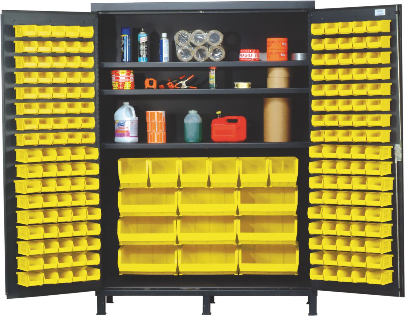 Bin Cabinet All-Welded With Yellow Bin 60In^ Bin Cabinet All-Welded With Yellow Bin, Made From 14In Gauge All-Welded Steel For Added Strength, Provides Security For Stored Contents With Three Point Locking Handle And Keys, With Gray Baked Enamel Finish, No. Bins: 185, Outer Dimension: 60 X 24X 84I