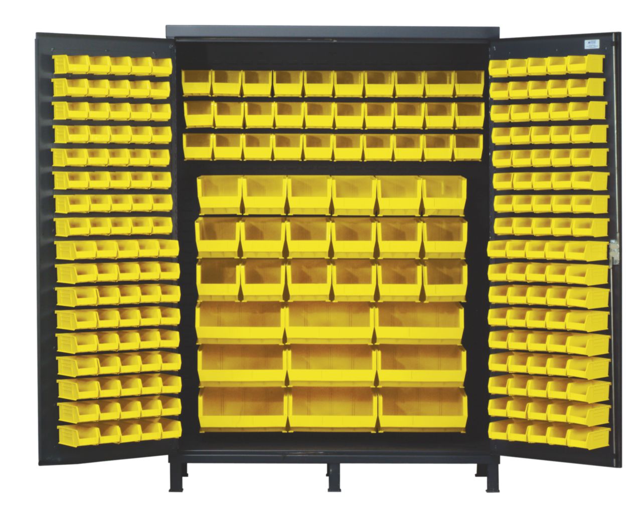 Bin Cabinet All-Welded With Yellow Bin 60In^ Bin Cabinet All-Welded With Yellow Bin, Made From 14In Gauge All-Welded Steel For Added Strength, Provides Security For Stored Contents With Three Point Locking Handle And Key, With Gray Baked Enamel Finish, No. Bins: 227, Outer Dimension: 60 X 24 X 84I
