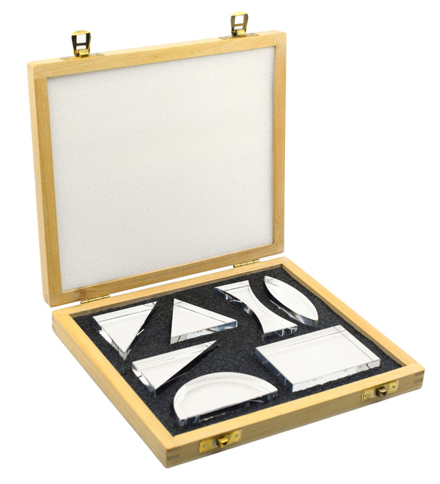 Set of 7 blocks in a wooden storage box. Each block is made of durable, highly polished acrylic material and measures 0.6" (15mm) thick. Excellent for physics classrooms, this set is ideal for a variety of experiments in optics, light refraction, spectrometry, and wavelengths. It's also great for photography lighting and distortion effects. The kit includes: • Rectangle: 75 x 50mm • Semi-Circle: 75mm diameter • Triangle: 60º x 60º x 60º - 58 mm sides • Triangle: 90º x 45º x 45º - 75mm hypotenuse • Triangle: 90º x 60º x 30º - 75mm hypotenuse • Bi-Convex: 75mm long - Curved faces have a 100mm radius • Bi-Concave: 75mm long - Curved faces have a 100mm radius Eisco Labs proudly manufactures its own products using state-of-the-art equipment and follows the highest standards of quality control. Each product is carefully designed by a team of laboratory professionals and experienced engineers with quality and durability in mind. They are manufactured with only the highest-grade raw materials, according to international quality standards, to ensure that they can withstand use in even the toughest laboratory environments.