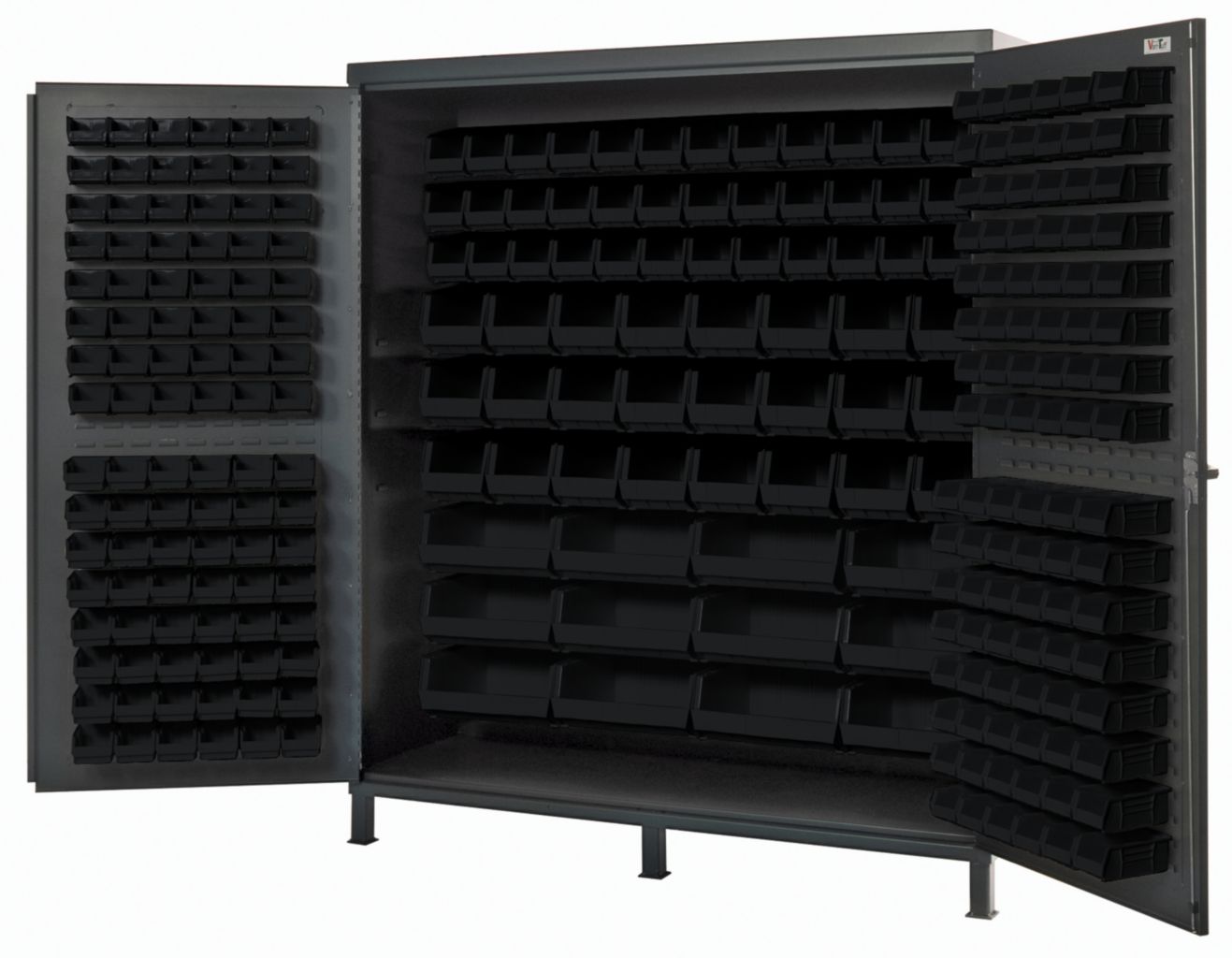 Bin Cabinet All-Welded With Black Bin 72In^ Bin Cabinet All-Welded With Black Bin, Made From 14In Gauge All-Welded Steel For Added Strength, Provides Security For Stored Contents With Three Point Locking Handle And Keys, With Gray Baked Enamel Finish, No. Bins: 264, Outer Dimension: 72 X 24X84I
