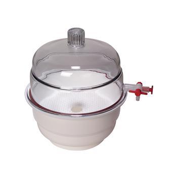 These autoclavable desiccators are made of polypropylene and polycarbonate and can hold vacuum up to 740mm Hg for 24 hours without any greasing. The PP stopcock has a self lubricating PTFE plug that works to create the vacuum, shut it off and release it. Autoclavable at 120°C for fifteen minutes. Non-vacuum desiccators are physically the same as vacuum desiccators; only difference is the absence of stopcock. Grease should be applied on the flanges to make it air-tight.