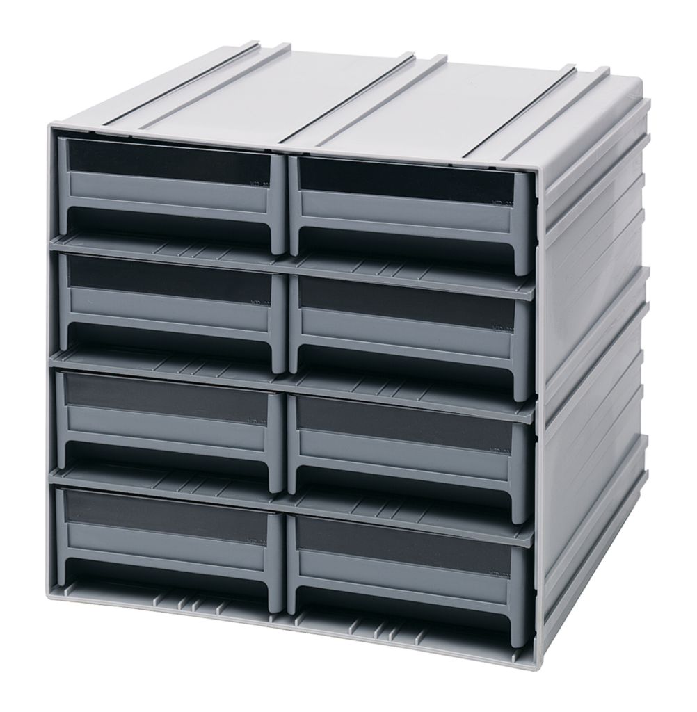 Cabinet^ Interlocking Storage Cabinets made of Highimpact polystyrene, Cabinets can interlock vertically or horizontally to crate a modular system, with 7 divider slots, Outside dimension: 11 3/8 Dx11 3/4 Wx11 H Inch, with 8 drawers 11 x5 5/8 x2 1/2 inch, Color: Gray