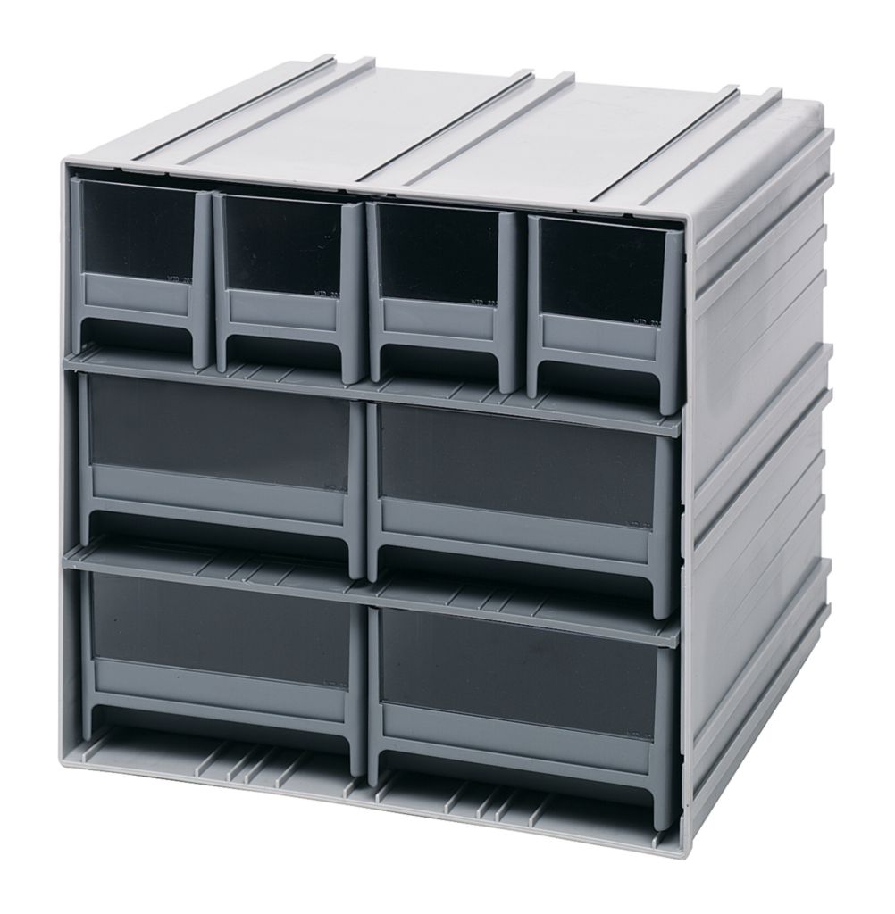 Cabinet^ Interlocking Storage Cabinets made of Highimpact polystyrene, can interlock vertically or horizontally to crate a modular system, with 7 divider slots, Outside dimension: 11 3/8 Dx11 3/4 Wx11 H Inch, with 4 drawers 11 x2 3/4 x3 5/16 inch and 4 drawers 11 x5 5/8 x3 5/16 inch, Gray color