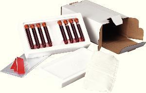Specimen Safety Foam Unit^ Designed to secure up to eight 7-10mL tubes and a 30mL bottle. Thick-walled specimen mailer is molded of special leak-resistant foam plastic.