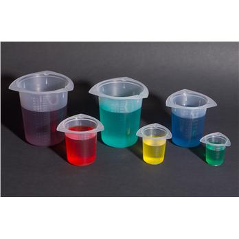 These sturdy polypropylene beakers boast three pouring lips to facilitate dripless dispensing. The beakers are graduated in both ounces and milliliters. They are available in packs of 100 or as an assortment pack containing 30 beakers, featuring five of each size.