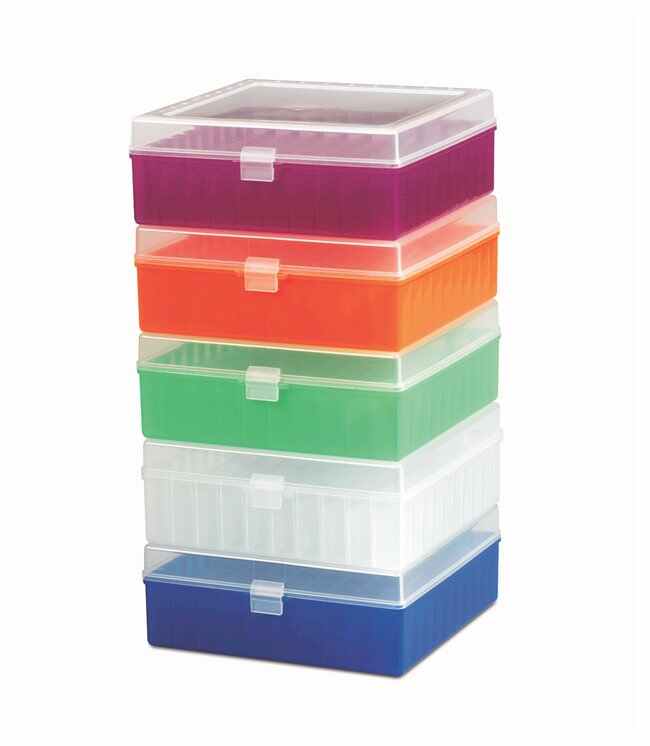 Polypropylene storage boxes provide compact storage and keep cryo vials organized on the bench, in the freezer or during transport. Unlike cardboard models these sturdy boxes will not break down with exposure to moisture and heavy use.