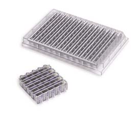 96-Well Disposable Electroporation Plate^ 4 mm gap, 250 ul. Consists of 96 individual wells with integrated electrodes.