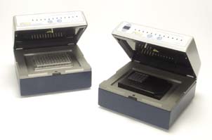 96-Well High Throughput Electroporation Plate Handler^ Features manual track switching and connectors for standard pulse generators. With gold-plated contacts to mate with the electrophoresis plate. Designed to operate in space-constrained areas such as laminar flow hoods