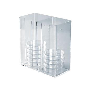 Free up benchtop spaceSturdy acrylic dispenser holds up to thirty 100 mm petri dishes in two easy-to-access partitions. Place on the counter or mount on a wall (mounting screws included). Measures 222 x 107 x 236 mm.