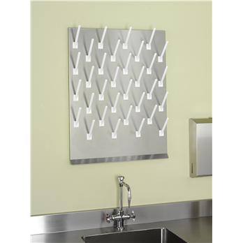Drying Rack, Stainless Steel, GlasswareMod-Rack pegboards serve a dual purpose in a modern laboratory. First, they allow you to quickly dry important, and often fragile, equipment in a sanitary manner. Second, our well-crafted pegboards are a safe place to store often used materials so they are readily at hand when you need them.The Barron pegboard is constructed from 20 gauge, type 304 stainless steel, polished to a #4 finish. The "B " style pegboard comes in 3 sizes and a variety of mounting options. Along the bottom edge is a drip deflector that diverts water away from wall and directs it to a sink or drain. Each Barron pegboard includes a wall bracket and standard 6 " white pegs.