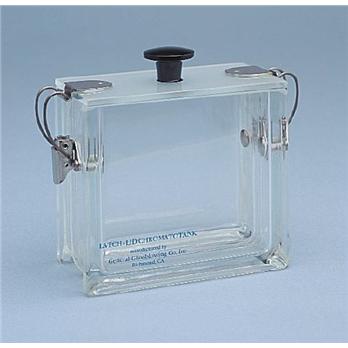 Requires less solvent to maintain equilibriumGives excellent retention of solvent saturated chamberHolds two 10 x 10 cm platesThe smaller cubic inch chamber allows for a faster and more uniform solvent-saturated atmosphere. Single molded tank has a flat ground top, beveled for safety on the inner and outer rims; bottom has been ground for stability. Unique latching device holds the matching ground glass surfaces of the lid and tank firmly in place. Metal components of the latch lid mechanism are made of stainless steel.