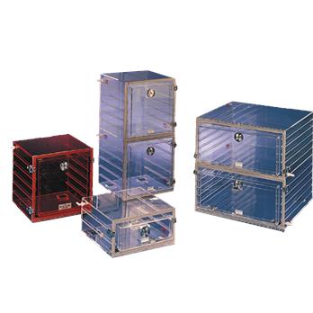 Plas-Labs desiccators are designed to protect, store, or assist in moving critical materials and prevent contamination. They are dust and moisture free enclosures which safeguard valuable research specimens or sensitive electronic components. Under positive N2 gas flow, they prevent moisture from penetrating the molecular structure of stored components. You may easily observe the status of your components without opening the door. FeaturesUnique "Gasket Guard " system prevents gaskets from taking a set thus destroying their effectivenessAll shelves have perforated slots (grooves) for optimum gas saturationUnits are all stackable with non-slip grip tight feetStandardization of construction means inter changeable shelvingAll chambers with two or more cubicles have a built-in cubicle dividerClosed cellular PVC gasketingUnits are constructed of optically clear acrylicEach cubicle has two nylon gas nipples 1/8 x 1/4 NPT hose barb fitting (90° elbows)Slip-a-part hinges are standardSealing clamps are spring loaded for uniform tensionBuilt in hygrometer-(RH)All units have acrylic door guards to prevent warping and possible contamination or loss of internal atmosphere