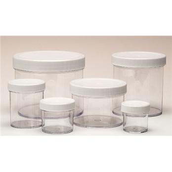 Specifications With attached polypropylene screw capClear polystyrene offers clarity of glass and safety of plastic Good resistance to inorganic chemicals 30 to 1000 mL sizes General storage containers are suitable for use with powders and solids. The large surface area on these jars makes it easy to label, either on the wide-mouth cap or directly on the side of the jar. Unlike glass jars, plastic jars will not break easily when bumped or dropped, making them a good choice for field sampling. Pre-attached white polypropylene screw cap has foamed polyethylene liner.Thomas No.Size (mL )Cap1230G913043-4001230G926053-4001230G9312558-4001230G9425089-4001230G9550089-4001230G961000120-400