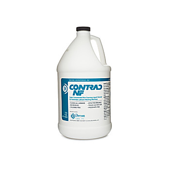 CONTRAD® NF is a non-foaming highly concentrated LIQUID detergent for use in any automatic labware washing machine that dispenses liquids. Phosphate-free and chlorine-free so ideal for environmental lab use and tissue culture work. It is particularly recommended for high-quality glassware cleaning where total rinsability and residue-free results are vital. As such, it lends itself to specialized industrial cleaning processes – biotechnology glassware, sample collection bottles, EPA glassware, pharmaceuticals and food packaging, etc. Most dishwashers have a preset surfactant dispensing facility and CONTRAD® NF should be used according to machine makers recommendation. Water supply to the machine is critical! Hard water may leave salt deposits on repeatedly cleaned surfaces. Low pressure supplies will provide inadequate rinsing. High pressure/high flow-rate deionized water supply will maximize cleaning quality, and rinse consistency. CONTRAD® NF is highly alkaline and should be treated as corrosive. Wear protective clothing, eye and skin protection when handling. Because of it’s high alkalinity, contact with non-ferrous metals should be avoided.
