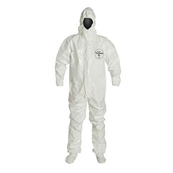 DuPont™ Tychem® 4000 delivers effective protection against a range of chemical environments. Tychem® 4000, utilizes Saranex™ 23-P film laminated to Tyvek® fabric to provide a rugged and durable fabric that resists abrasion. Tychem® 4000 fabric provides at least 30 minutes of protection against >124 chemical challenges. Typical applications: chemical mixing, hazardous remediation, emergency medical response, paint spraying, and nuclear environments.Taped seams provide strong chemical resistance against heavy liquid splashes. A sewn seam is covered with a strip of compatible chemical-resistant material through heat sealing.Attached respirator-fit hood with elastic around face opening, designed to cover neck and chin and fit around respirator face maskStrong zipper for tough, flexible closureStorm flap covers zipper which can be sealed by the wearer with adhesive strip to prevent intrusion at zipperElastic opening for tighter fit at wrist Integrated socks composed of garment materialAttached flaps are designed to cover boot tops to help reduce potential for liquid intrusio