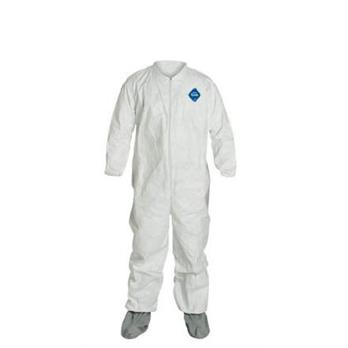 Tyvek® 400 garments are composed of flash spun high density polyethylene which creates a unique, nonwoven material available only from DuPont. Tyvek® 400 provides an ideal balance of protection, durability and comfort of any limited use fabric technology. Tyvek® 400 fabric offers an inherent barrier against particles (down to 1.0 micron in size). Protection is built into the fabric itself; there are no films or laminates to abrade or wear away. Tyvek® 400 fabric's durability advantage over microporous film fabrics delivers consistently better barrier, even after wear and abrasion. Applications include: lead and asbestos abatement/remediation, general maintenance/operations, spray painting, general clean-up.Multiple interlocking threads are sewn around the raw edges of garment material to create a strong, stress-resistant seamLaydown collarElastic opening for tighter fit at wristAttached Tyvek® FC boots have special coating to provide added skid-resistance