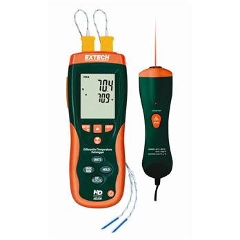 Specifications Datalogs up to 18,000 readings on each channelDisplay [T1, T2, T3(IR)] or [T1-T2] or [T1-T3] or [T2-T3]Differential T1-T2 display for HVAC/Superheat measurementsHeavy Duty rugged double molded housingMAX/MIN/AVG and Data HoldUse IR Thermometer probe to measure non-contact surface Temperature up to 1022°F (550°C); 8:1 distance to spot ratio and Laser pointerUser selectable 1°/0.1° resolutionTriple LCD display (when IR probe is plugged in)USB port includes softwareIncludes two Type K bead wire temperature probes, IR Thermometer probe, Windows® compatible software with USB cable, hard carrying case, and 9V batterySpecificationsRangeBasic AccuracyTemperature (Type K)-328 to 2501ºF (-200 to 1372ºC)±0.15%Temperature (IR)-22 to 1022ºF (-30 to 550ºC)±2%Resolution0.1°/1° Distance to Spot ratio8:1 Datalogging18,000 readings (continuous) Dimensions7.9 x 2.9 x 1.9 " (201 x 75 x 50mm) Weight9.8oz (280g)