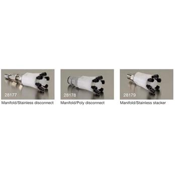 The HPLC Poly Manifold enables up to six waste lines (per manifold) from HPLC processes to be fed into a single intake fitting. Manifolds have six 1/4-28 ports and one 3/8 " NPT port (all come with caps for unused ports) and either one quick disconnect in No. 316 stainless steel or polypropylene, or a No. 316 stainless steel stacker connector. The six ports are tapped to accommodate the 1/4-28 threads of the separately available compression fittings.The compression fittings, sold in sets of six, accommodate tubing sizes of either 1/16 " and 1/8 " OD. The fittings are approximately 1 " long and made of Tefzel™. They include ferrules for a compression fit to the waste line.Manifold #28179 has a "stacker " connection enabling it to attach on top of a #28177 or 28178 and allowing up to a total of 12 waste lines to be fed into the disposal can. Multiple manifolds may be used on a custom-designed Quick Disconnect container as long as one disconnect remains unused to permit venting and prevent back pressure. Safety Can with Manifold installed is OSHA complaint and meets NFPA Code 30.