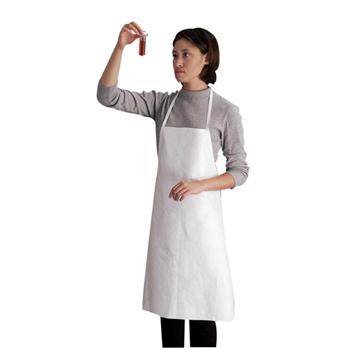 Protect against fluidsTwo styles availableHeavy-duty apron is made of Tyvek for durability and is designed to provide users with disposable protection from fluid contamination. Apron ties in back and has a protective area measuring 37” x 42.5”. Packaged 20 per box, 4 boxes per case.Tyvek bib apron (pictured) is a one-piece, knee length garment. Apron ties in back for a comfortable fit. One size fits all.