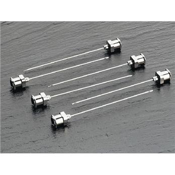 Specifications Metal and Kel-F® hub304 stainless steel needleStandard 2” lengthUse with Luer Tip and Luer Lock syringes sold without needle or for Luer adapters. Nickel-plated brass or Kel-F (CTFE) hubs fit both male and female Luer connectors.They allow quick change of needle and use of different gauge and/or style needles with the same barrel.Point Style 2 tips have a 22° beveled point recommended for septum penetration. The tip is slightly bent, partially obstructing the orifice, minimizing septum coring and needle plugging.Point Style 3 is a blunt (90°) point for use with HPLC injection valves and for sample pipetting.Thomas No.Hamilton No.Needle GageNOMINALNOMINALPoint Style IDOD Needles WITH METAL HUBS8929G019003926s.005.01928929G039002626.010.01928929G059003822s.006.02828929G079002222.016.02828929G099103926s.005.01938929G119102626.010.01938929G139103822s.006.02838929G159102222.016.0283>Needles WITH KEL-F HUBS8929G219013926s.005.01928929G239012626.010.01928929G259013822s.006.02828929G279012222.016.02828929G299053926s.005.01938929G319053326.010.01938929G339053422s.006.02838929G359013422.016.0283