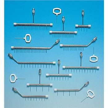 Manifolds for Drummond MicrodispenserFor use with 7691K20 Microdispenser and L55 Repeat Kit or L60 Pall Valve for multiple, simultaneous deliveries to microtest platesManifolds are stainless steel, with removable Teflon® end caps and Luer connector for attachment to pall valveAutoclavableStraight-type manifolds have a central intake shaft perpendicular to manifold and Teflon plug at either end of the manifoldBent-type manifolds have offset intake shaft, mounted at one end of the manifold and a Teflon plug at the other endThis configuration minimizes contamination of sterile microtest platesCan be connected to vacuum line for use as an aspirator7691N80 through N92 Manifolds have delivery spouts on 4.5 mm centers for use with 384-well plates. 7691R10 through R60 Manifolds have delivery spouts on 9 mm centers for use with 96-well plates. 7691R75 Manifold has delivery spouts on 20 mm centers for use with 24-well plates. Furnished with a cleaning wire which has attached finger loop. Listings indicate number of delivery spouts and type of manifold.