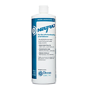 NEUTRAD® is a safe detergent for manual scrub cleaning of any labware – replaces old fashioned caustic soap powders! Highly concentrated, very economical. Liquid NEUTRAD® is instantly soluble, totally rinse-able, safe, near-neutral pH and phosphate-free. Offers huge performance and safety advantages over soap powders. Cost comparisons with soap powders are simple – 1 Liter of NEUTRAD® is equal to 2 lbs. of soap powder, 5 Liters is equal to 11 lbs. of soap powder.