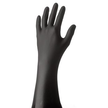 Specifications Disposable 100% accelerator-free nitrilePowder-freeRolled cuffSmooth finishPatented low-modulus formulationTear-away featureAmbidextrousProtects the hand from a wide array of chemical hazards while avoiding type I and type IV latex allergies. Gloves are easy to put on and remove. Cuff prevents dirt from entering the glove. Gloves feature a second skin feel and are aasy to tear away in case of emergency break. They can easily be one-hand used. The user's wrist is well protected.RECOMMENDED FOR THESE RISKS:Chemical splashesViruses and bacteriaSizes:6-7/S 7-8/M 8-9/L 9-10/XLLength:Dependent on size, in mm (flat)280Color:BlackThickness:in mm0.15
